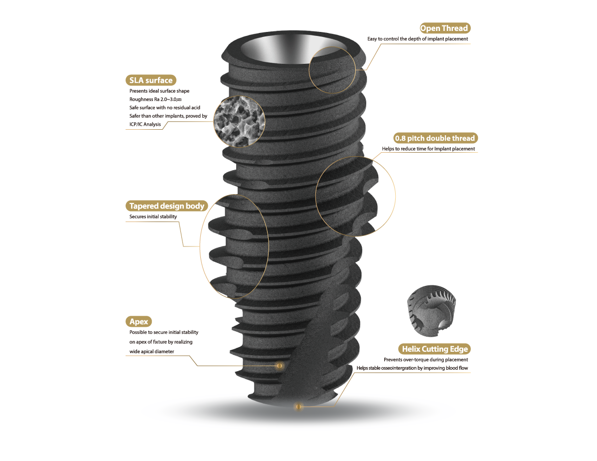- Kết hợp ren sâu V-thread và Buttress thread, phân tán lực nhai tối ưu trên xương loại III-IV.